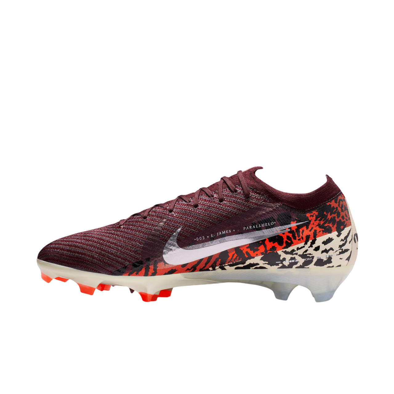 The Nike United collection celebrates wildly fast athletes like Lauren James and Salma Paralluelo. We paired rich burgundy tones with animal print-inspired graphics to represent how they attack on the field and go beyond what's possible.